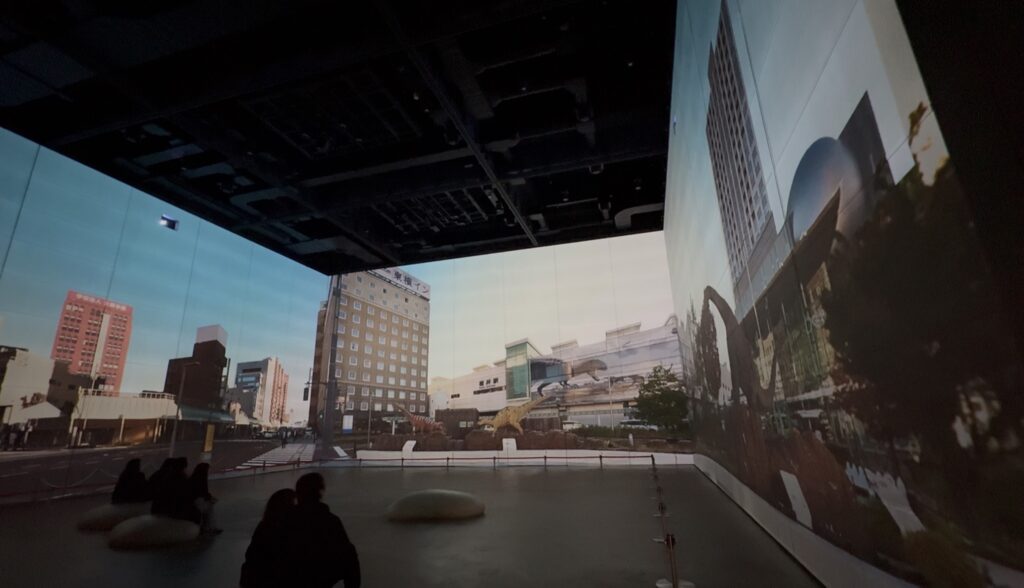 コの字に囲まれた3面×高さ9m×横16mの巨大特設スクリーン内で実物大の恐竜が動き回る様子は、めちゃくちゃ引き込まれます!