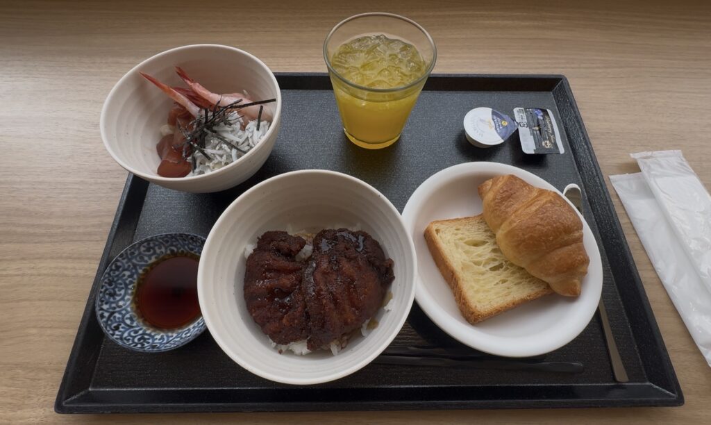 まずはソースカツ丼!こちらはセルフで丼にごはんをよそい、タレをかけ、カツをのせます!