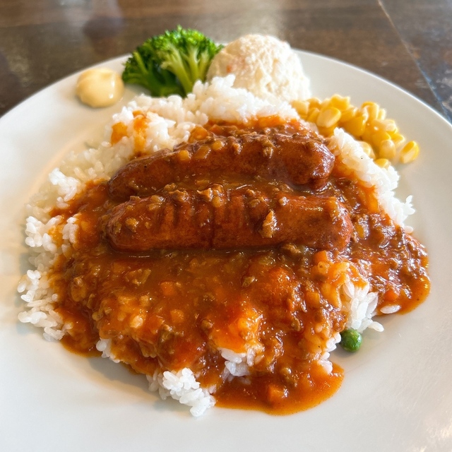 たっぷりのバターライスの上に、グリルしたソーセージが2本と、ミートソースがかかっています。
